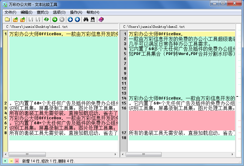 以左側文件為標準,右側文件新增了14行,修改了1行,刪除了4行。