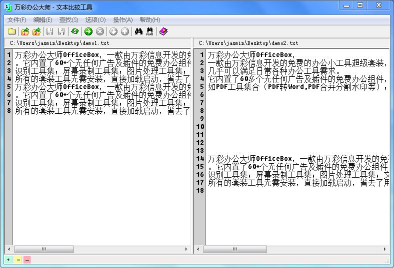 通過使用文本比較工具, 可以快速比較兩個文件的內容區別。 內容不同之處會被自動標記成不同的顏色,清晰明了,方便修改。在這個工具里面, 您可以選擇自定義高亮顏色, 設置水平分割方式, 搜索查找替換文件內容等。